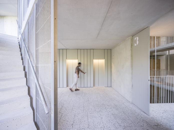 El proyecto, desarrollado por Peris Toral Arquitectes junto a Eletresjota Tècnics Associats, parte de una idea clara: organizar la complejidad del programa residencial a través de una secuencia de cinco patios interconectados por pasarelas que funcionan como calles elevadas. Esta solución no solo garantiza iluminación y ventilación natural en todas las viviendas, sino que genera espacios intermedios pensados para la relación social.